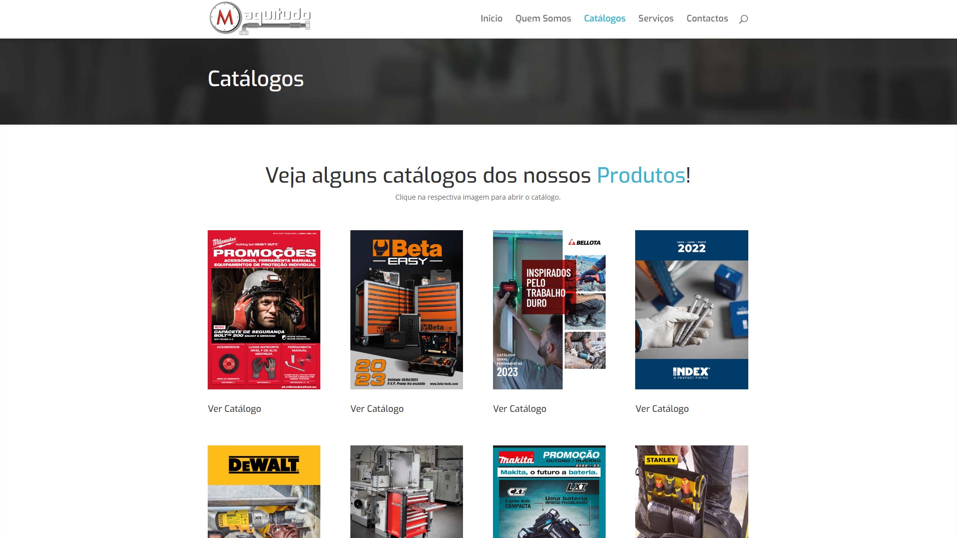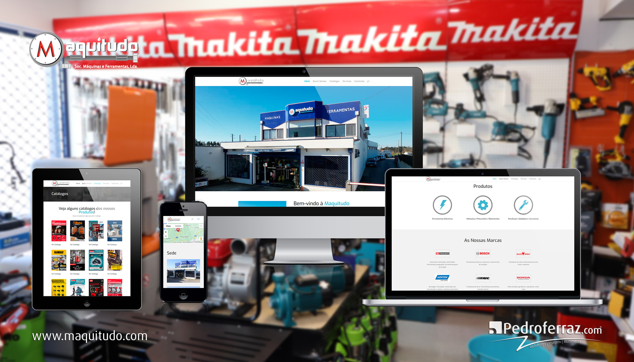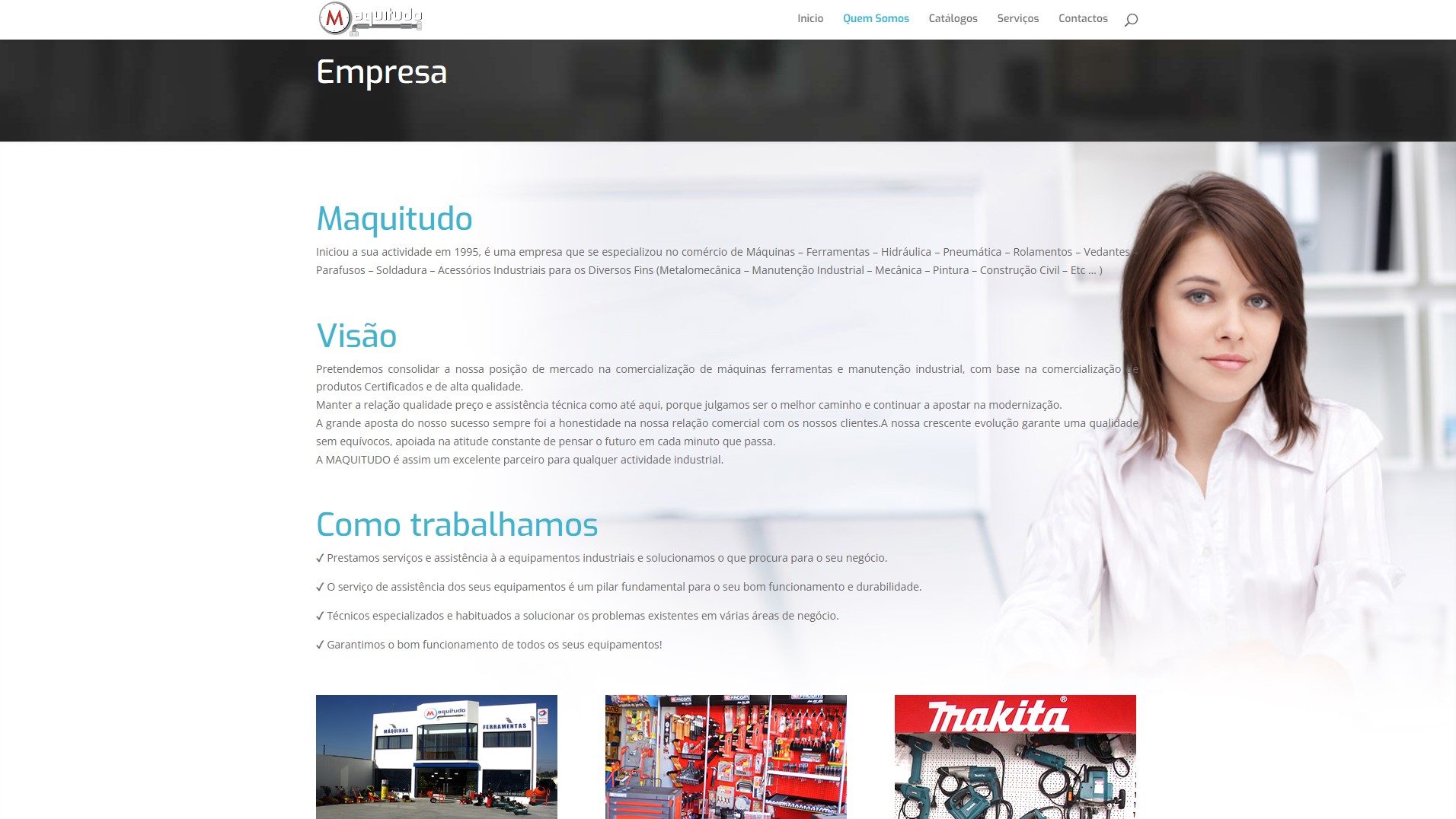 “A Maquitudo iniciou a sua atividade em 1995 e dedica-se ao comércio de Máquinas-Ferramentas-Hidráulica-Pneumática-Rolamentos-Vedantes-Parafusos-Soldadura-Acessórios Industriais para os Diversos Fins (Metalomecânica-Manutenção Industrial-Mecânica-Pintura-Construção Civil )”